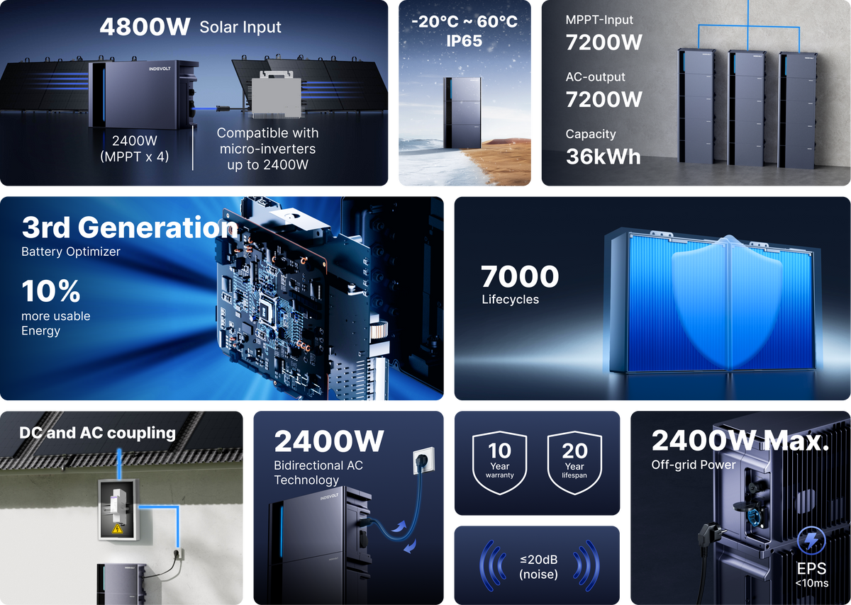 - Parallel Expansion: Supports free stacking operation of up to 3 groups, increasing capacity directly to 36 kWh and the solar input to 7200W.