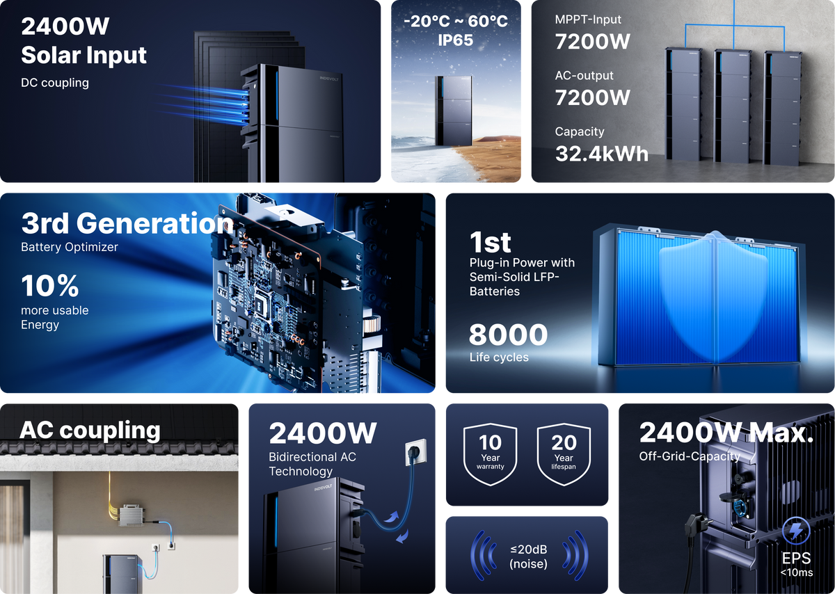 - Max. 2400W in Off-grid Operation: Automatic switch-over within 10 ms to keep essential devices running smoothly in case of a power outage.
